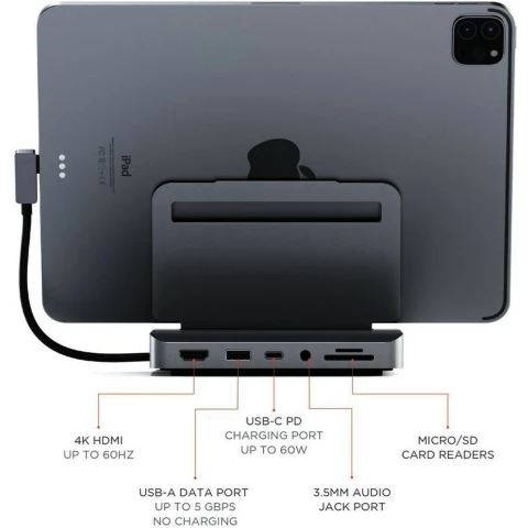 док-станция USB-C с функцией подставки, для планшета iPad Pro, порты: USB-С (только для зарядки, 60Вт), USB 3.1, HDMI, джек аудио 3.5мм, кардридер SD/microSD, встроенный кабель для подключения, материал корпуса: сплав алюминия