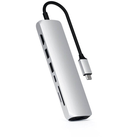 внешний USB-концентратор, порты: Gigabit Ethernet, USB-C PD, 2хUSB 3.0, 4K HDMI, micro/SD, цвет: серебристый