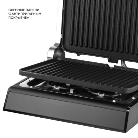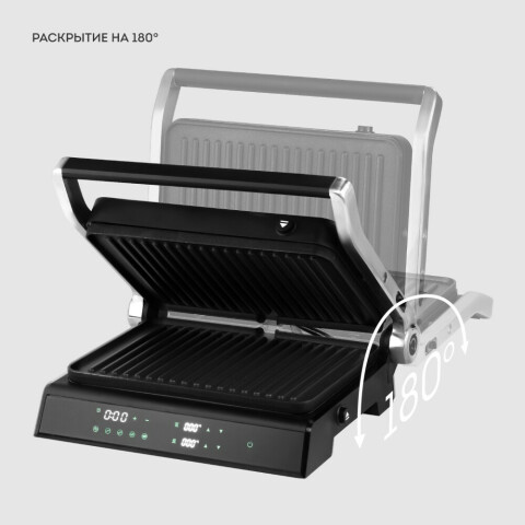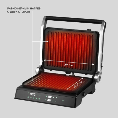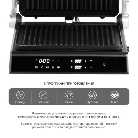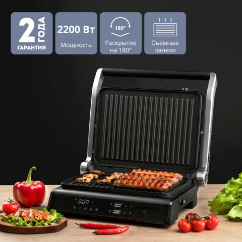 контактный гриль, мощность: 2200 Вт, антипригарное покрытие, поддон для сбора жира, электронное управление, регулировка температуры