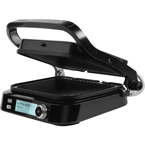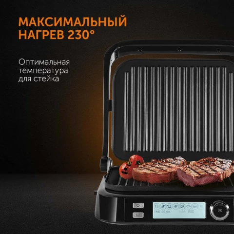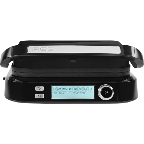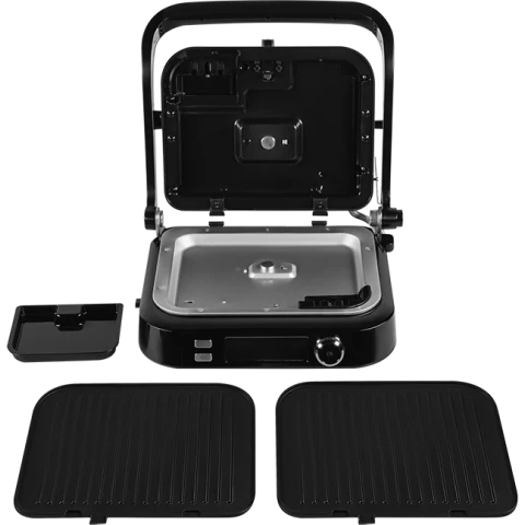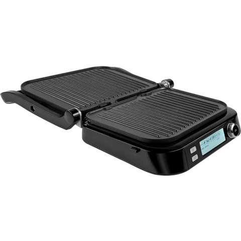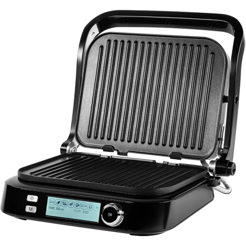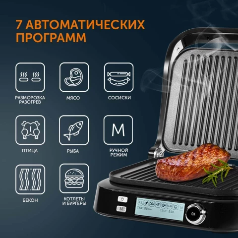 контактный гриль, мощность: 2100 Вт, антипригарное покрытие, поддон для сбора жира, защита от перегрева, электронное управление, регулировка температуры