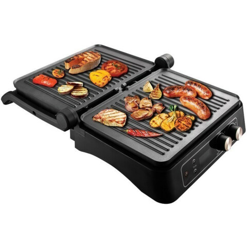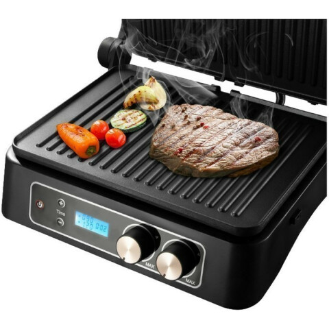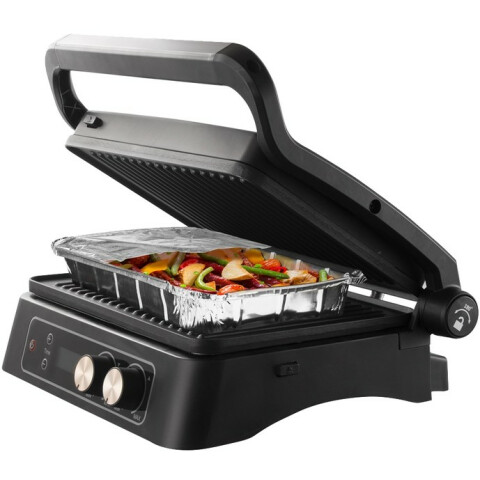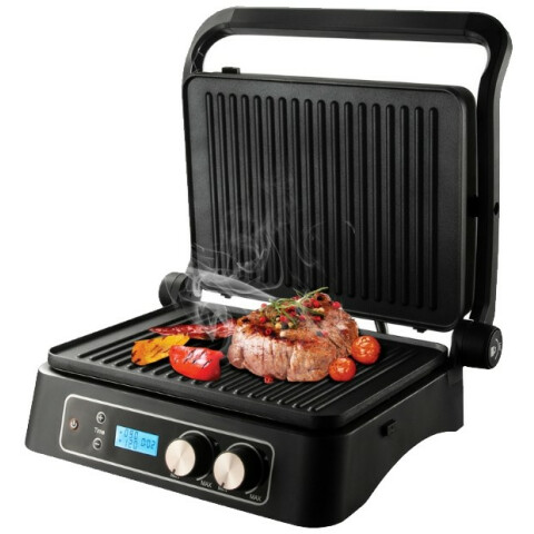 контактный гриль, мощность: 2000 Вт, антипригарное покрытие, поддон для сбора жира, защита от перегрева, электронное управление, регулировка температуры
