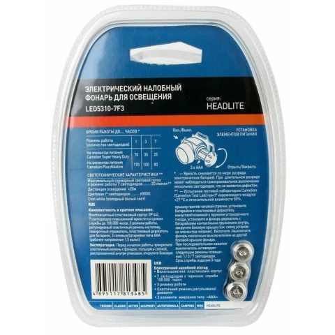 налобный фонарь, световой поток: 19 лм, дальность освещения: 20 м, тип батарей: AAA