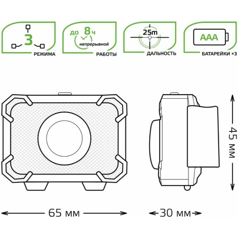 тип: налобный, световой поток: 150 лм, дальность освещения: 25 м, максимальное время работы: 8 ч, тип батарей: AAA