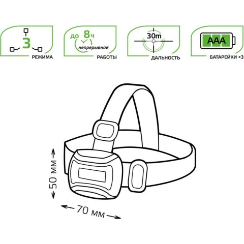 тип: налобный, световой поток: 180 лм, дальность освещения: 30 м, максимальное время работы: 8 ч, тип батарей: AAA