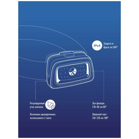 налобный фонарь, световой поток: 220 лм, тип батарей: AAA