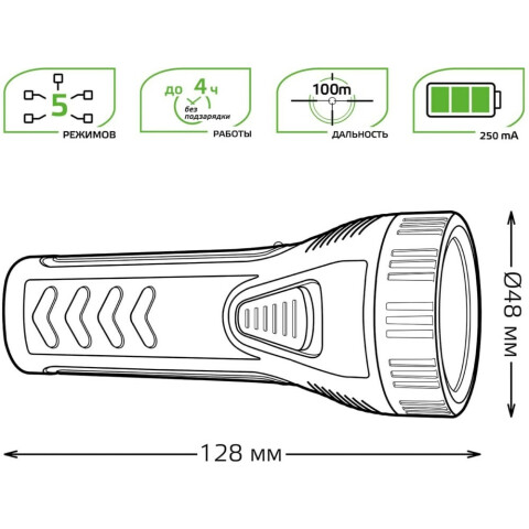 тип: ручной, световой поток: 50 лм, дальность освещения: 100 м, максимальное время работы: 4 ч, встроенный аккумулятор