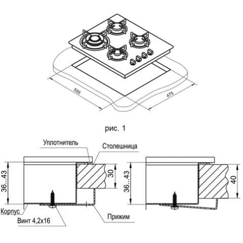 газовая варочная панель, независимая установка, количество конфорок: 4, поворотные переключатели