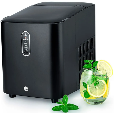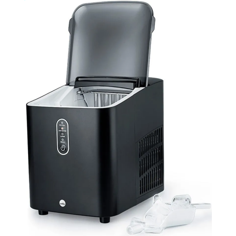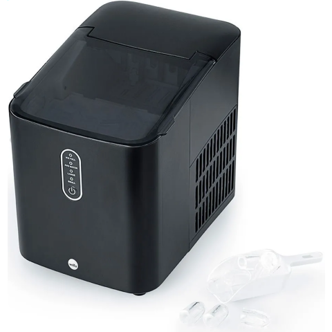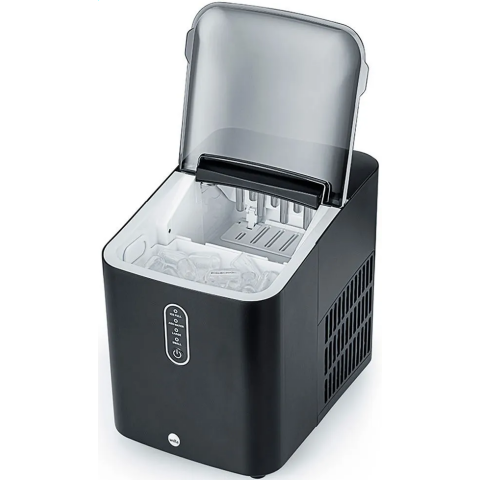 компактный льдогенератор, 100 Вт, резервуар 2 л, готовность льда - 6-13 минут после старта (зависит от размера и комн. темп.), производительность 56 шт/час или 12 кг за 24 часа, два размера кубиков: 2.4x3.4/2.2x3.2 мм