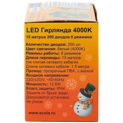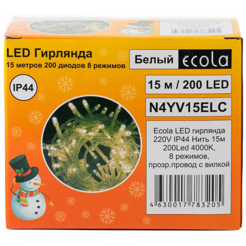 Гирлянда ECOLA Нить 15м 200Led 4000K (IP44)