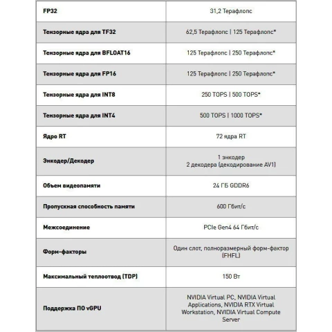 Бренд: nVidiaускоритель вычислений, универсальных потоковых процессоров: 8192, объем памяти GDDR6: 24ГБ, интерфейс: PCI-E 4.0 x16, пассивное охлаждение, разъем доп. питания 8-pin, спецификации и особенности см. ниже