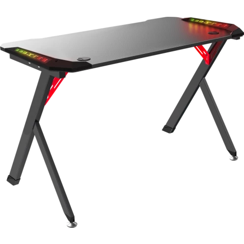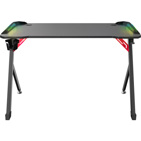 игровой стол, материал столешницы: ДПК, металлический каркас, нагрузка до 120 кг, подсветка, подстаканник, держатель для наушников, отверстия для кабелей