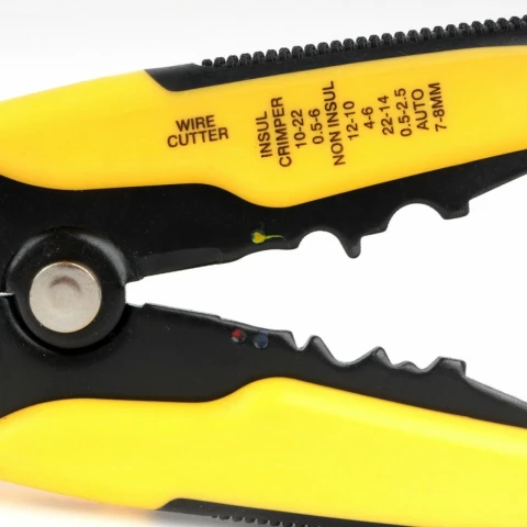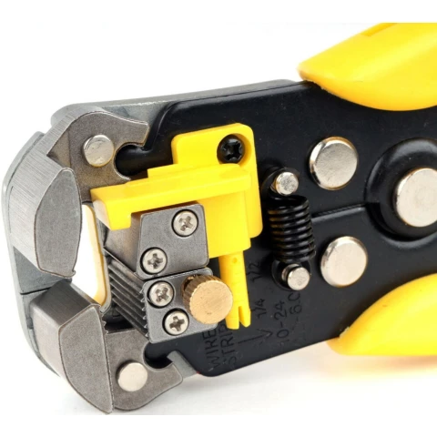 автоматически подстраивающийся инструмент (стриппер) для зачистки проводов и обжима контактов, диапазон проводов: AWG24 - AWG10 (0.2- 6 мм), диапазон обжима высоковольтных проводов зажигания 7-8 мм
