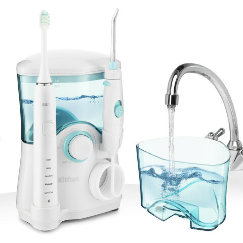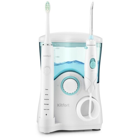 Бренд: Kitfortзубной центр с импульсным ирригатором, питание ирригатора от сети, звуковая щетка, питание щётки от аккумулятора, насадки: насадка-щетка, для струйной чистки, для чистки языка, ортодонтическая (для брекетов), режим струи, емкость резервуара: 600 мл