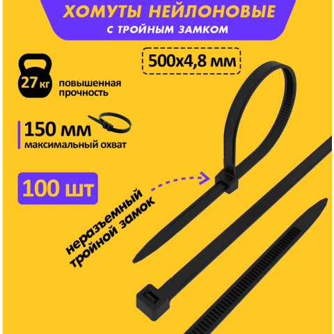 стяжка, 50 см x 4.8 мм, диаметр охвата 150 мм, цвет: чёрный, 100 шт.