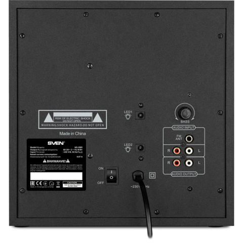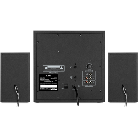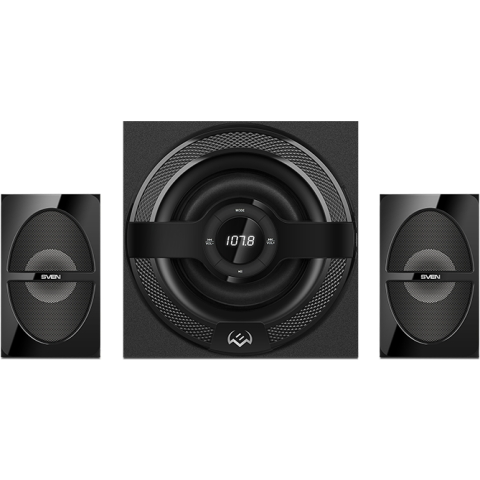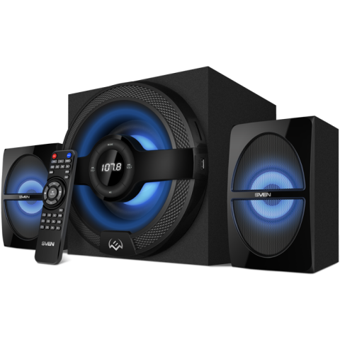 компьютерная акустика 2.1, мощность 60 Вт, корпус из MDF, питание от сети, радиотюнер, пульт ДУ