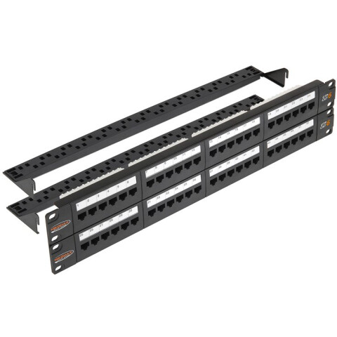 коммутационная панель, 2U, 48 угловых портов, категория 6 (Класс E), 250МГц, RJ45/8P8C, 110/KRONE, T568A/B, неэкранированная, с органайзером, черная