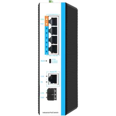 неуправляемый индустриальный коммутатор на DIN рейку, 4 PoE (802.3af/at/BT) порта 1 Гбит/с, 1 x SFP/1000Base-X, 1 x 1000Base-T (PD 60Вт)