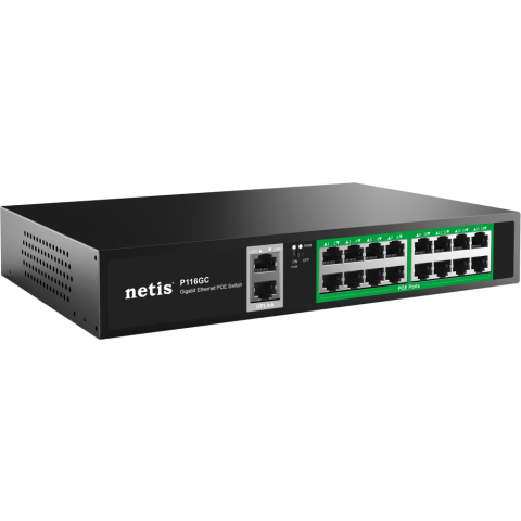 коммутатор неуправляемый, 16 портов Ethernet 1 Гбит/с с поддержкой PoE, 2 порта Uplink 1 Гбит/с, PoE бюджет: 240 Вт, размеры 270 x 45 x 180 мм