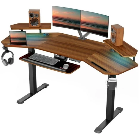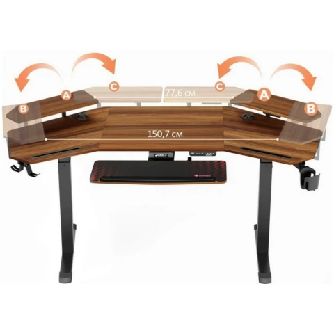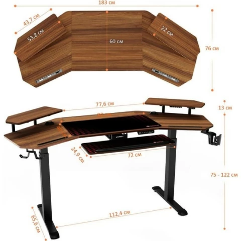 компьютерный стол, материал столешницы: ЛДСП, металлический каркас, нагрузка до 100 кг, регулировка по высоте, подсветка, подстаканник, держатель для наушников, полка для клавиатуры, отверстия для кабелей, полка для монитора, USB-разъём