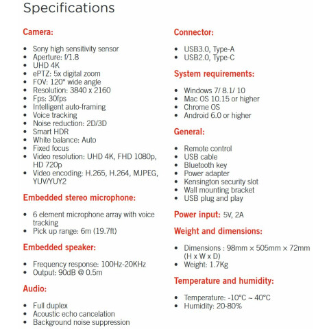 4K ePTZ конференц-камера, 120° FOV, цифровой zoom 5x, микрофонный массив (6 шт.) с точной локализацией источника звука, эхоподаление, работа со всеми распространенными средами ВКС