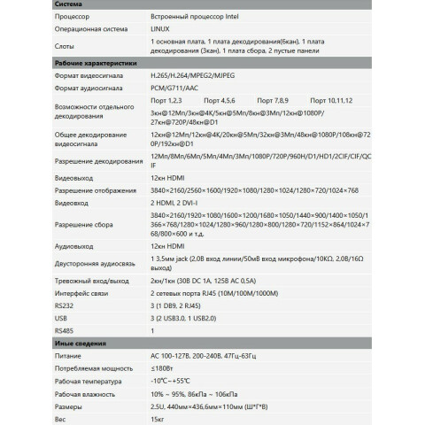 Бренд: Dahuaсетевой видеодекодер Ultra-HD, H.265/H.264/MJPEG/MPEG4/MPEG2 декодирование видеосигнала до 12 Мп, 2 кан HDMI и 2 кан DVI-I вход, поддерживает 4K сбор(HDMI), поддерживает 1/4/9/16 разделение отображения, 180 Вт