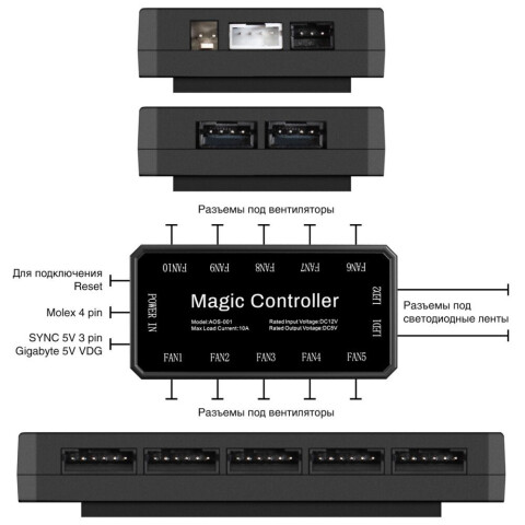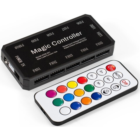 контроллер управления ARGB, поддержка до 10 вентиляторов 6 pin, до 2 светодиодных лент, управление цветом, яркостью и скоростью вращения вентиляторов, синхронизация с MSI Mystic Light Sync, GIGABYTE RGB Fusion, Aura Sync, в комплекте пульт ДУ