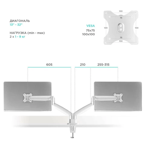 | для монитора, настольный, 13-32", до 9 кг, выдвижной, наклонный, поворотный, белый | 2 366 смн. |