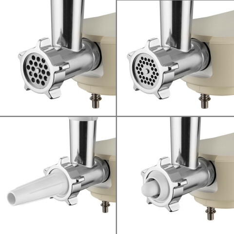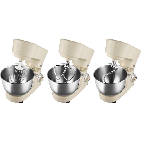 мощность: 1200 Вт, объем чаши: 5 л, блендер из ударопрочного стекла, мясорубка, терка, насадка для взбивания