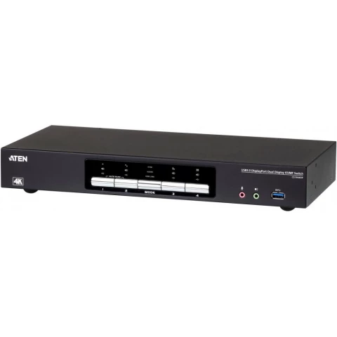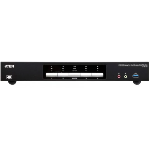 4-портовый KVMP переключатель, порты KVM: 8x DisplayPort@4096x2160@60Гц, 4x USB3.1 Gen 1, 8x 3.5мм mini jack, консольные порты: 2x USB, 2x DisplayPort, 4x 3.5мм mini jack, выбор станции: ползунковый переключатель