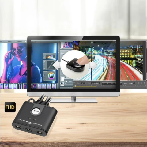 2-портовый кабельный KVM-переключатель, USB, FHD HDMI, поддержка 1920x1080/1200@60Гц, выбор компьютера с помощью пульта ДУ, поддержка HDCP 1.4, работа с Windows, Mac и Linux