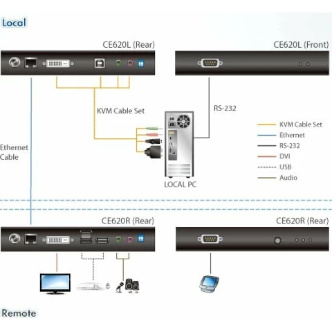 KVM удлинитель, включает в себя локальный блок CE620L и CE620R удаленный блок, а так же USB-кабель 1.8м, два адаптера питания, комплект специальных DVI KVM-кабелей и комплект для монтажа