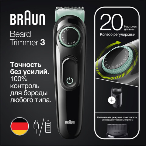 для бороды и усов, питания: автономное, длина стрижки: 1-10 мм, число установок длины: 20