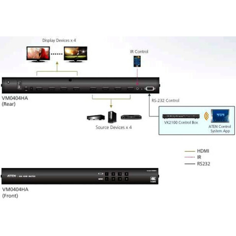 матричный коммутатор HDMI 4x4, входы: 4x HDMI, выходы: 4x HDMI, макс. разрешение: 4096x2160, макс. расстояние: 15м, макс. скорость передачи данных: 10.2 Гбит/с, управление: RS-232, ИК
