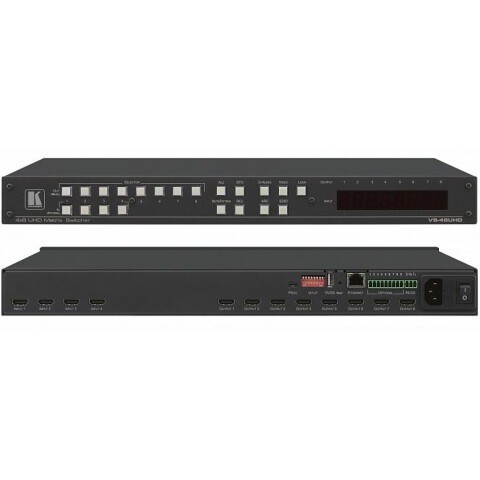 матричный коммутатор 4х8 сигналов HDMI разрешением до 4K@60Hz (4:2:0) и встроенных цифровых аудиосигналов, 7-сегментный дисплей, сеть Ethernet, RS-232, в комплекте шнур питания и крепление для 19" стойки