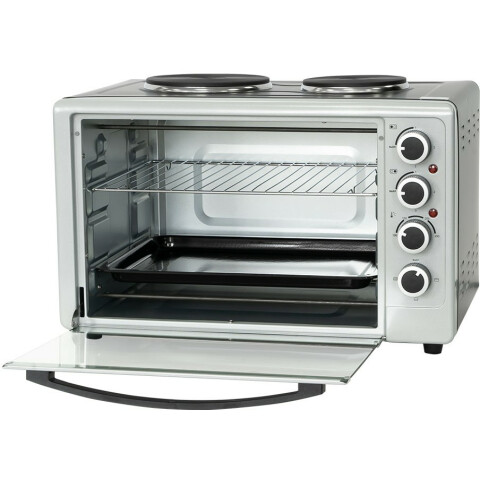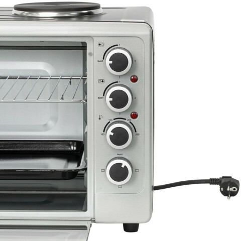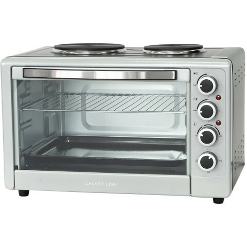 1650 Вт, объём камеры: 48 л, управление: механическое, режимы работы: 3, режимы температуры: 100-250 °С, мощность конфорок: 1000/850 Вт, в комплекте: противень для выпечки, решетка-гриль, держатель для противня и решетки