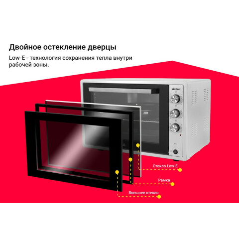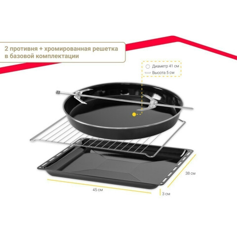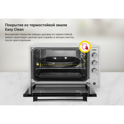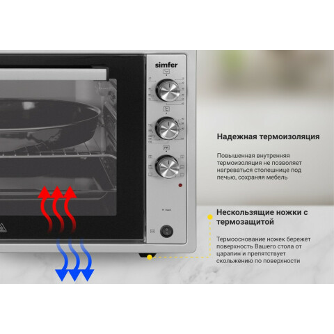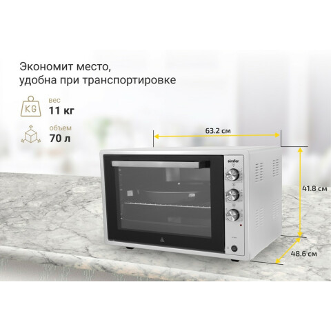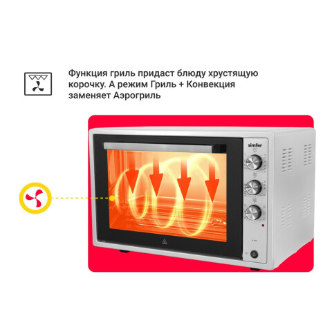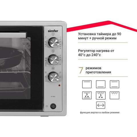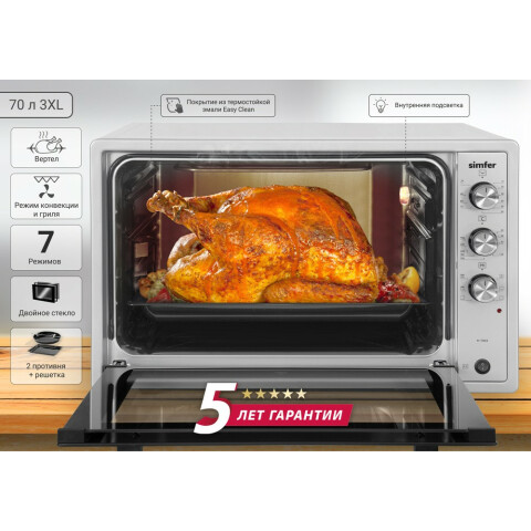 мощность 1800 Вт, объём 70 л, макс. температура 240 °C, 7 режимов работы, механическое управление, гриль, конвекция