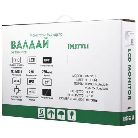 27", IPS, 1920x1080 (Full HD), 5 мс, 75 Гц, 250 кд/м2, 178°/178°, VGA, HDMI, DisplayPort, динамики, чёрный