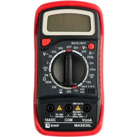 Бренд: EKFцифровой мультиметр с измерением проводимости, макс. изм. напряжения/силы тока/сопротивления: 600В/10A/2МОм, мин. разреш. способность изм. DC: 0.1мВ, тест на непрерывность, категория изм. цепи: 3, ручной выбор диап. измерений