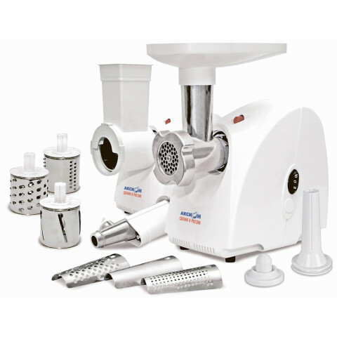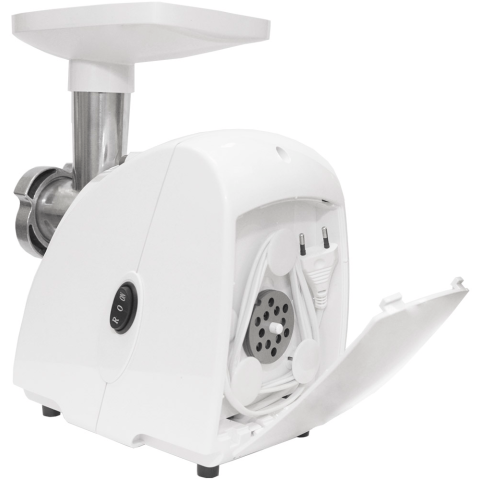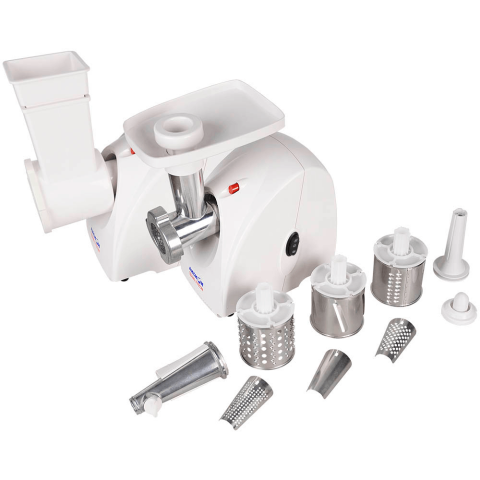 мощность 230 Вт, перерабатывает 1.7 кг/мин, насадка-терка, насадка для шинковки, насадка для кеббе, диск для фарша, корпус из пластика, шнековая соковыжималка, отсек для хранения насадок