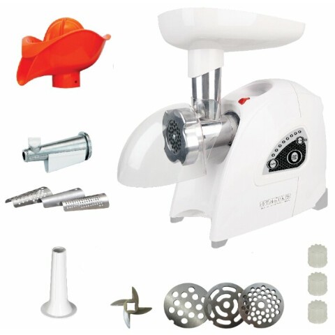 мощность 250 Вт, перерабатывает 2 кг/мин, насадка для приготовления колбас, корпус из пластика, цитрус-пресс и шнековая соковыжималка, отсек для хранения насадок