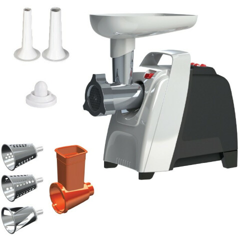 перерабатывает 4 кг/мин, насадка-терка, насадка для приготовления колбас, насадка для шинковки, насадка для кеббе, диск для фарша, корпус из пластика, отсек для хранения насадок