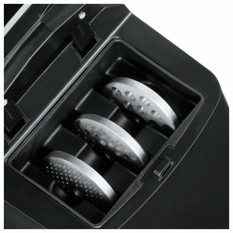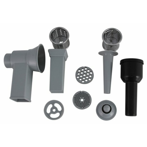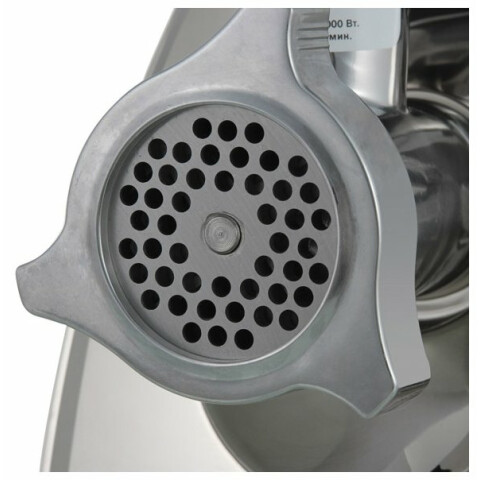 мощность 700 Вт, перерабатывает 3.5 кг/мин, насадка-терка, насадка для приготовления колбас, насадка для шинковки, насадка для кеббе, диск для фарша, сделана из пластика и металла, отсек для хранения насадок