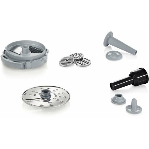 мясорубка, мощность 800 Вт, перерабатывает 4.3 кг/мин, насадка-терка, насадка для шинковки, насадка для приготовления колбас, насадка для кеббе, корпус из пластика, отсек для хранения насадок