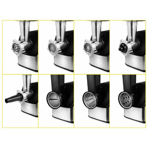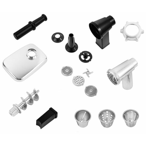 перерабатывает 2.3 кг/мин, насадка-терка, насадка для приготовления колбас, насадка для шинковки, насадка для кеббе, диск для фарша, сделана из пластика и металла