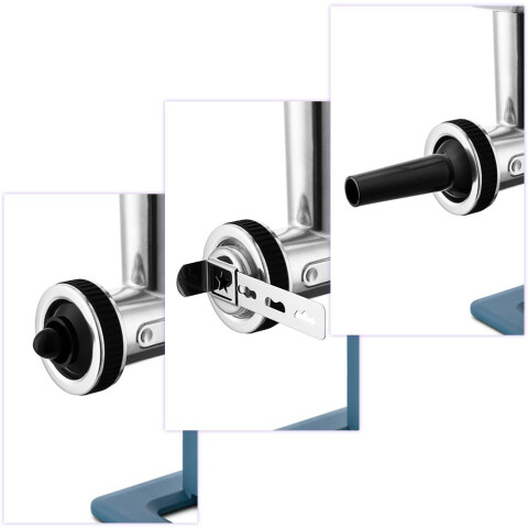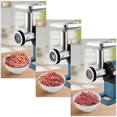 мощность 1000 Вт, перерабатывает 1 кг/мин, насадка для приготовления колбас, насадка для кеббе, диск для фарша, металлический корпус, отсек для хранения насадок