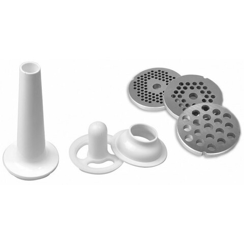 мясорубка, мощность 500 Вт, перерабатывает 2 кг/мин, насадка для приготовления колбас, насадка для кеббе, сделана из пластика и металла, отсек для хранения насадок