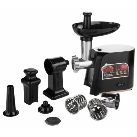 мясорубка, мощность 300 Вт, перерабатывает 1 кг/мин, насадка-терка, насадка для шинковки, насадка для приготовления колбас, насадка для кеббе, корпус из пластика