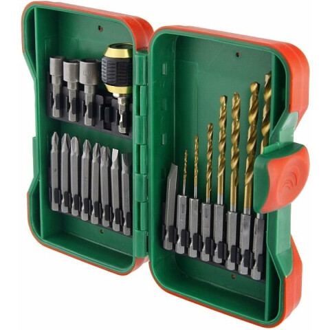 набор свёрл и бит по металлу (20 предметов); биты 50мм: PZ1, PZ2, PZ3, SL5, SL6, SL7, PH1, PH2, PH3; торцевые головки: 6, 8, 10; свёрла с хвостовиком 1/4": 1.5, 2, 3, 4, 4.5, 5, 6; магнитный битодержатель с фиксатором