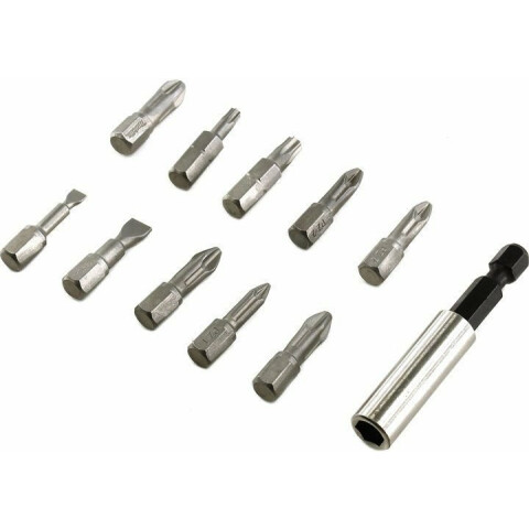 насадка с крестовой отверткой Ph2 2 шт, Pz1, Pz2 2 шт; насадка с плоской отверткой 0,6 х 4,5; 1,2 х 6,5; удлинитель-переходник для стандартных насадок; насадка с отверткой Torx T15, T25