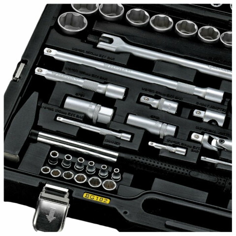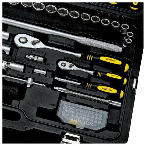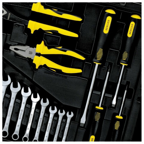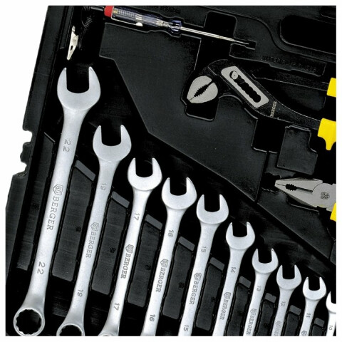 Бренд: BERGERинструменты: молоток, отвёртки, рукоять для бит, вороток для головок, трещотка, пассатижи, ключи гаечные, ключ переставной гаечный, оснастка: биты, торцевые головки, отвертка индикаторная, количество бит: 30 кг, количество торцевых головок: 24 шт.